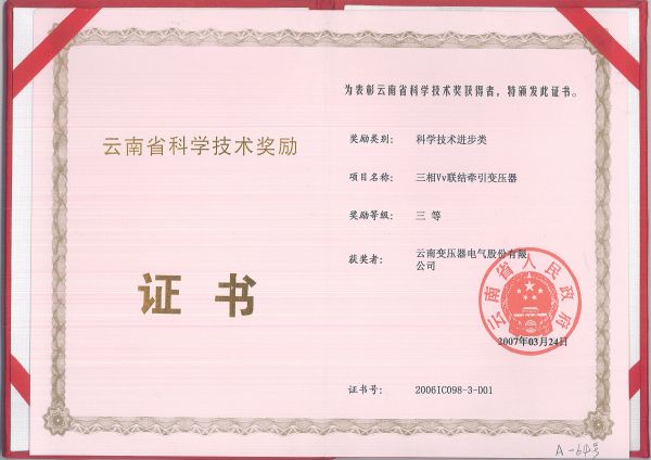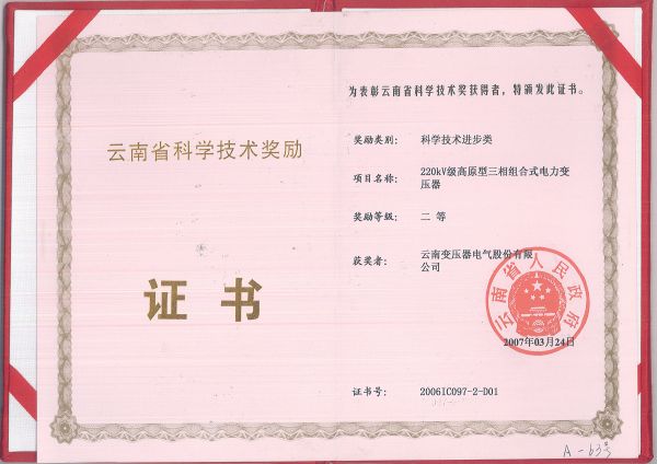 The Second Prize of Science and Technology Progress of Yunnan Province in 2007 -220kV Plateau Three-phase Combined Power Transformer