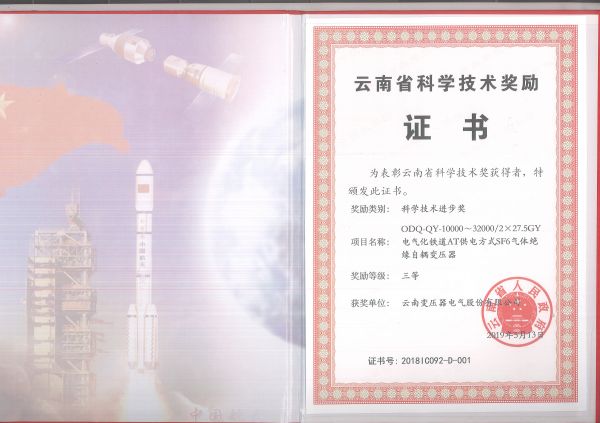 The Third Prize of Science and Technology Progress of Yunnan Province in 2018 - SF6 Gas-insulated Auto-transformer with AT power-supply Mode on Electrified Railway