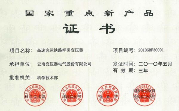 National Key New Product Certificate - High-speed Railway Traction Transformer