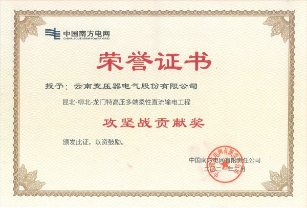 China Southern Power Grid-Kunming-Liuzhou-Longmen DC Project-Battle Contribution Award - Honorary certificate