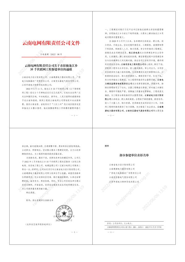 Letter of Commendation—Yunnan Power Grid Limited Liability Company