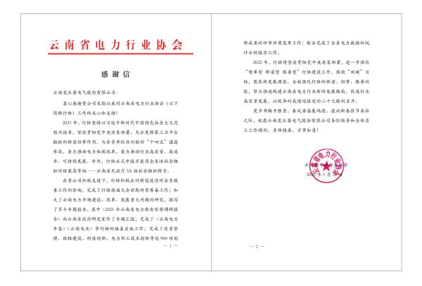 Letter of Thanks—China Electricity Industry Association