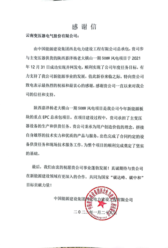 Letter of Thanks—Northwest Power Construction Engineering Co., Ltd.of China Energy Construction Group